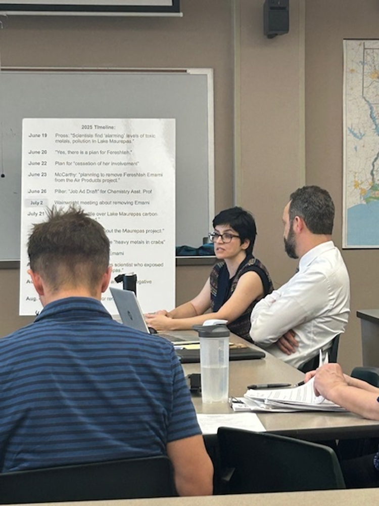 On Friday morning, 38 people assembled at Southeastern Louisiana University’s Fayard Hall to witness Dr. Fereshteh Emami’s grievance hearing. Emami, a celebrated analytical chemist and associate professor with tenure at SLU, was summarily fired from the Lake Maurepas Monitoring Project, after speaking to the media about her scientific findings. This hearing was the first leg in the process to try to win her job back.