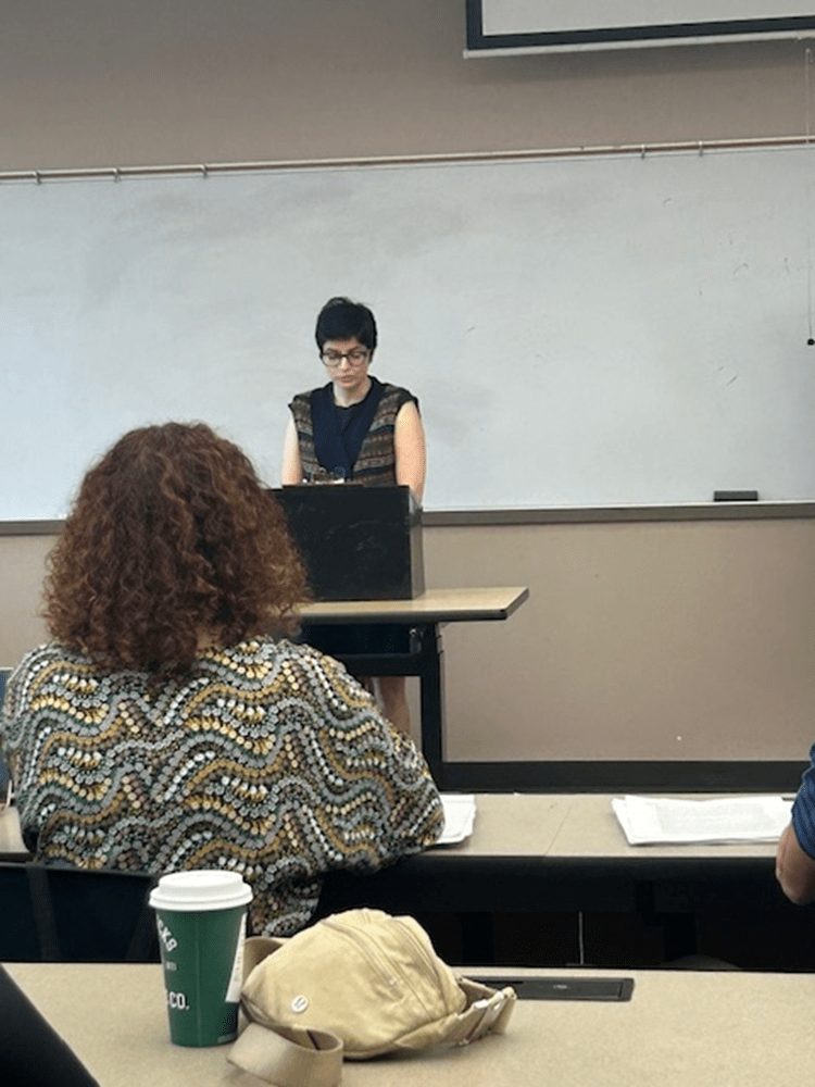 Fereshteh Emami, Ph.D., gives her presentation to Southeastern Louisiana University grievance committee Friday. In foreground, with back to camera, is grievance committee member Monique LeBlanc, Ph.D.