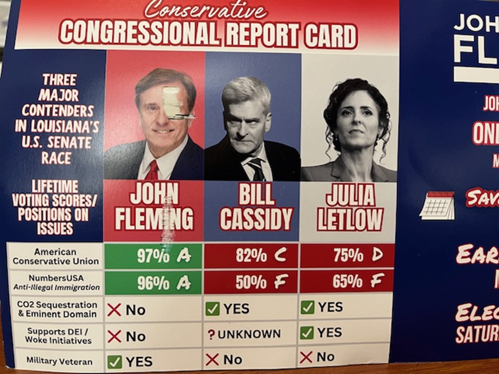 But she is anything but cute in that mailer from State Treasurer/physician/payday loan owner/fast food entrepreneur/former Congressman John Fleming who apparently doesn’t know what he wants to be when he grows up. Besides touting his conservative voting record, he includes a head shot of Letlow that is positively wretched—mouth drawn in a frown, hair in tangled strands, eyes appearing deep-set in a face etched in a decidedly negative expression. And the photo of Cassidy isn’t much better. He has the expression of an ax-murderer. And both the Cassidy and Letlow pics are in black-and-white while Fleming beams at the camera with a pleasant smile and in full color, proving once again, the age-old political strategy that substance is nothing; it’s all in the perception.