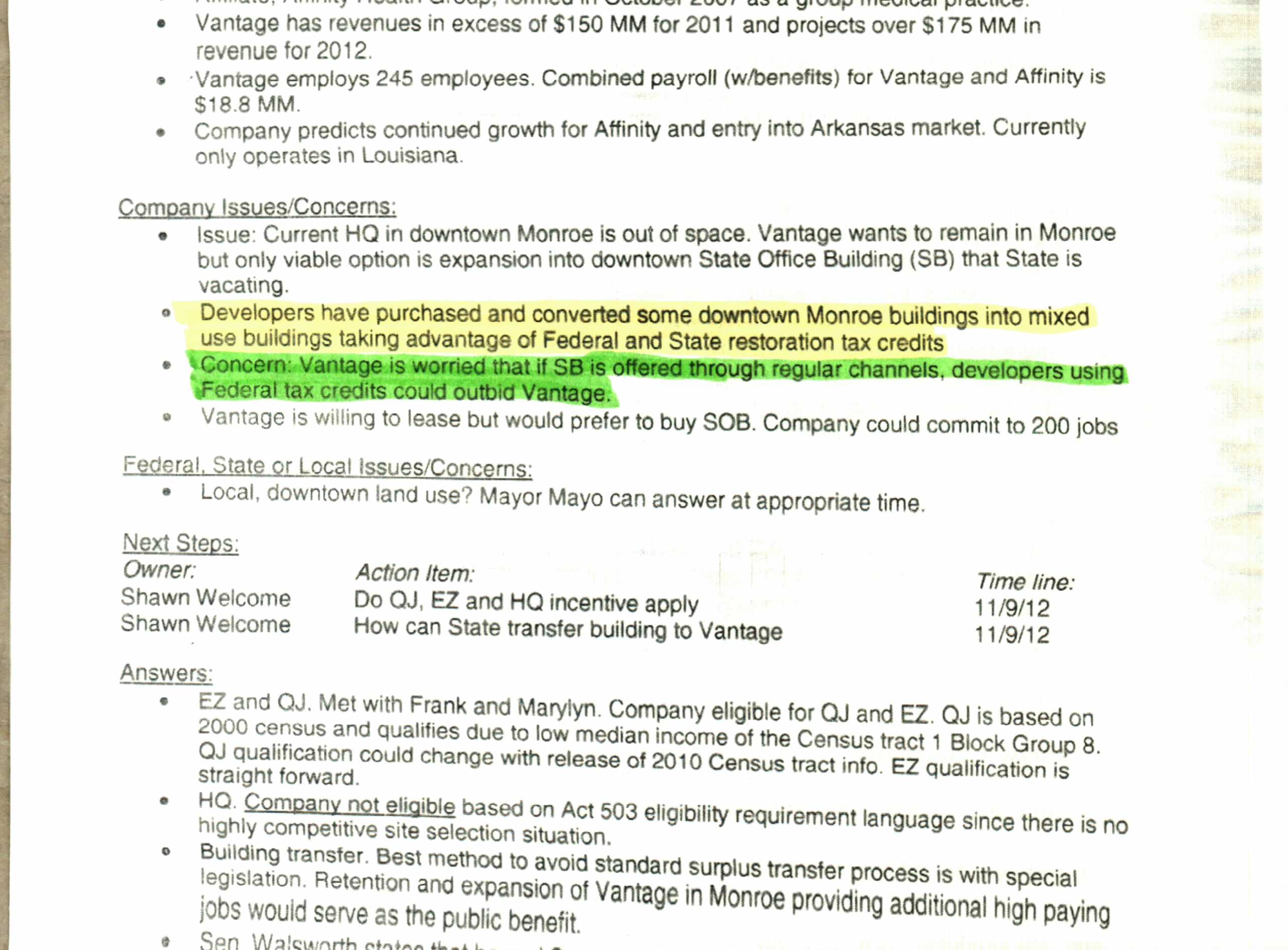Another document appears to be an internal memorandum that provides an overview of a 2012 meeting about the sale. It indicates that LED Secretary Stephen Moret, Sen. Walsworth, LED Legislative and Congressional Liaison Mandi Mitchell and LED Director of Contract Performance Shawn Welcome were in attendance on behalf of the state and Dr. Jones and his son-in-law Michael Echols, Director of Business Development, representing Vantage.