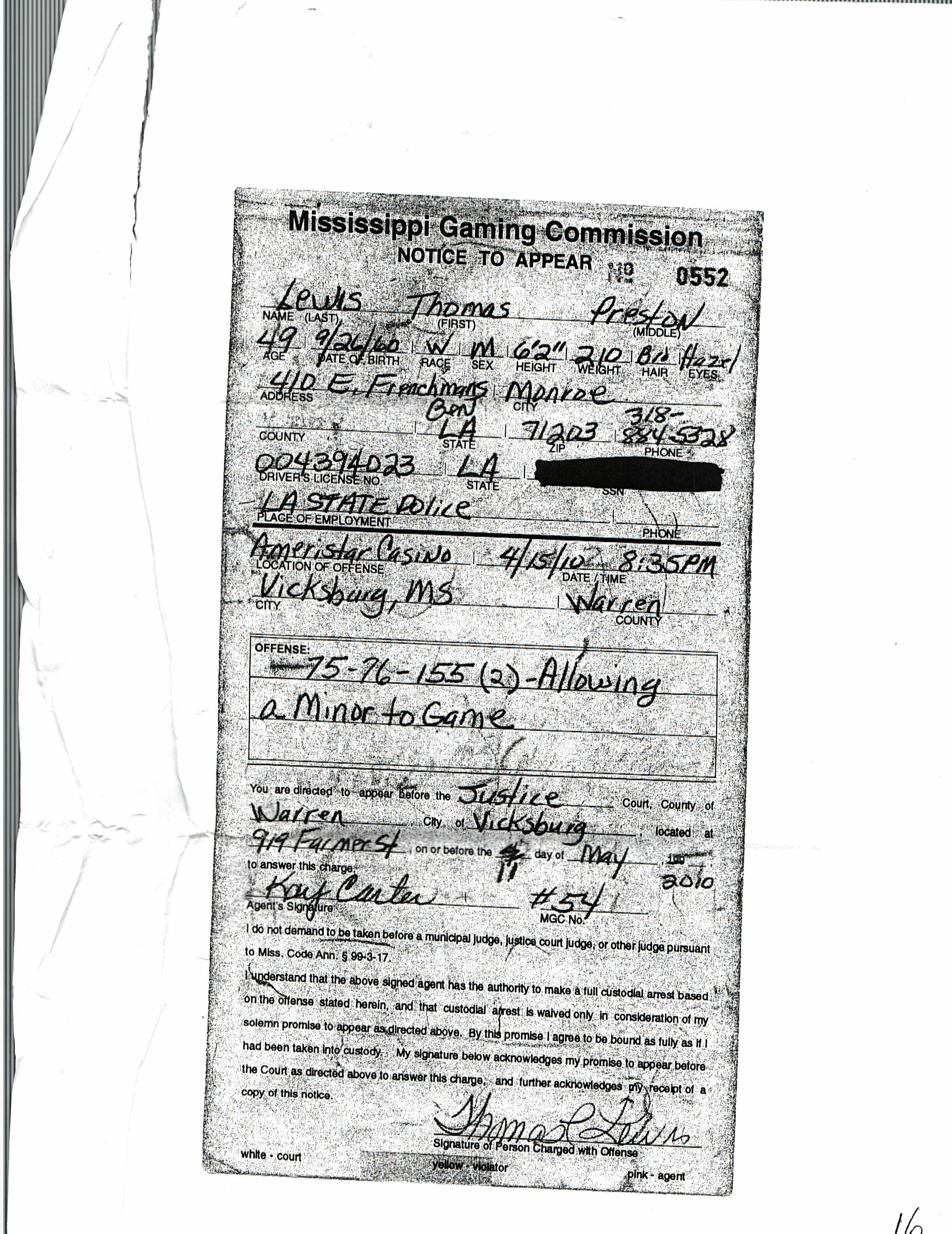 A trip to Vicksburg by LouisianaVoice turned up nothing. A Helpful deputy we encountered at the courthouse there, however, made several calls on our behalf and learned that the court record had been expunged. But the Mississippi Gaming Commission in Jackson still had records of the citation and Lewis’s court appearance at which he entered a guilty plea. Those documents were mailed to us pursuant to our public records request.