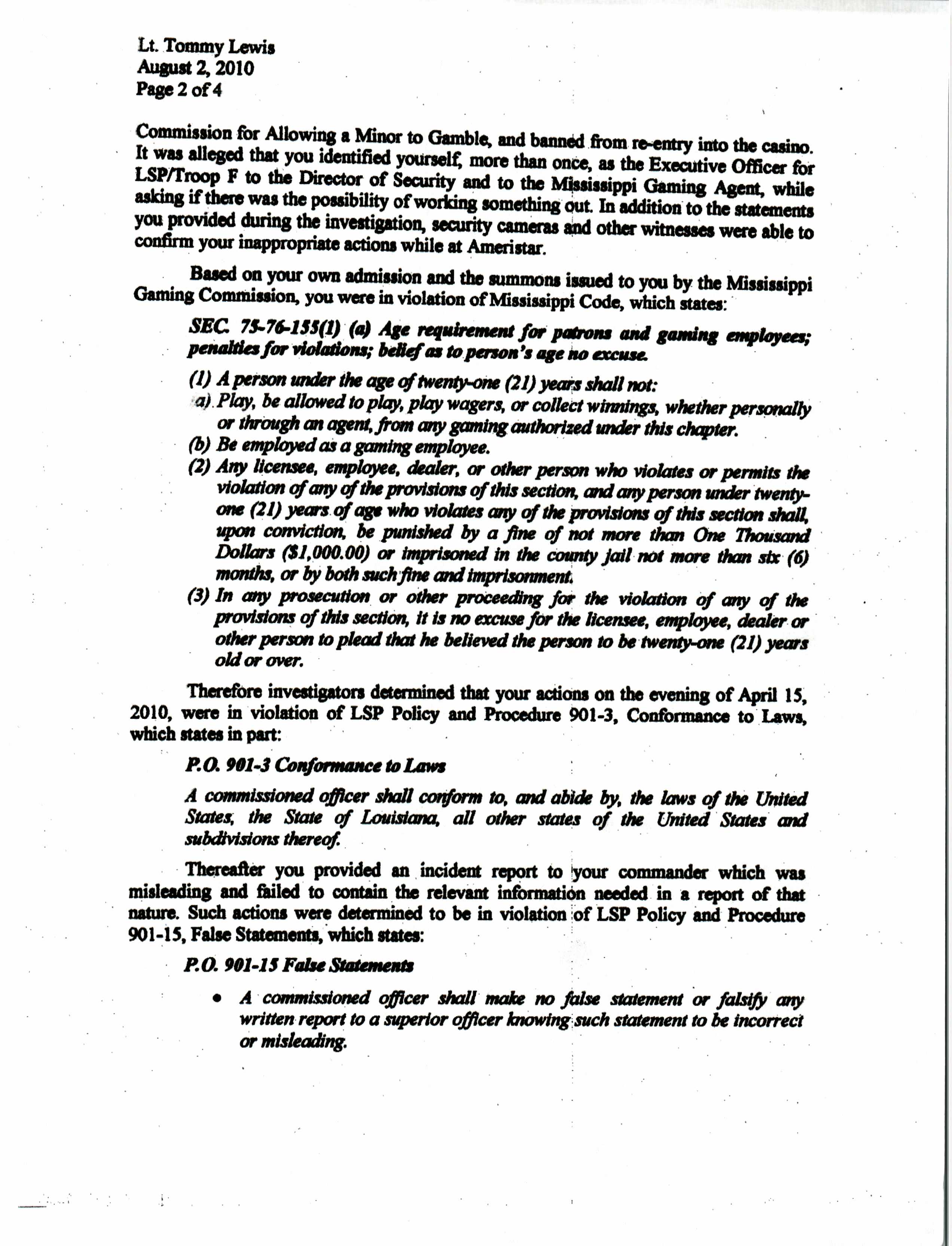 After being issued a summons by an agent of the Mississippi Gaming Commission for allowing a minor to gamble and being banned from re-entry into the casino, “it was alleged that you identified yourself more than once as the Executive Officer for LSP/Troop F to the Director of Security and to the Mississippi Gaming Commission agent while asking if there was the possibility of working something out,” Edmonson wrote (emphasis ours). “In addition to the statements you provided during the investigations, security cameras and other witnesses were able to confirm your inappropriate actions while at Ameristar,” he said.