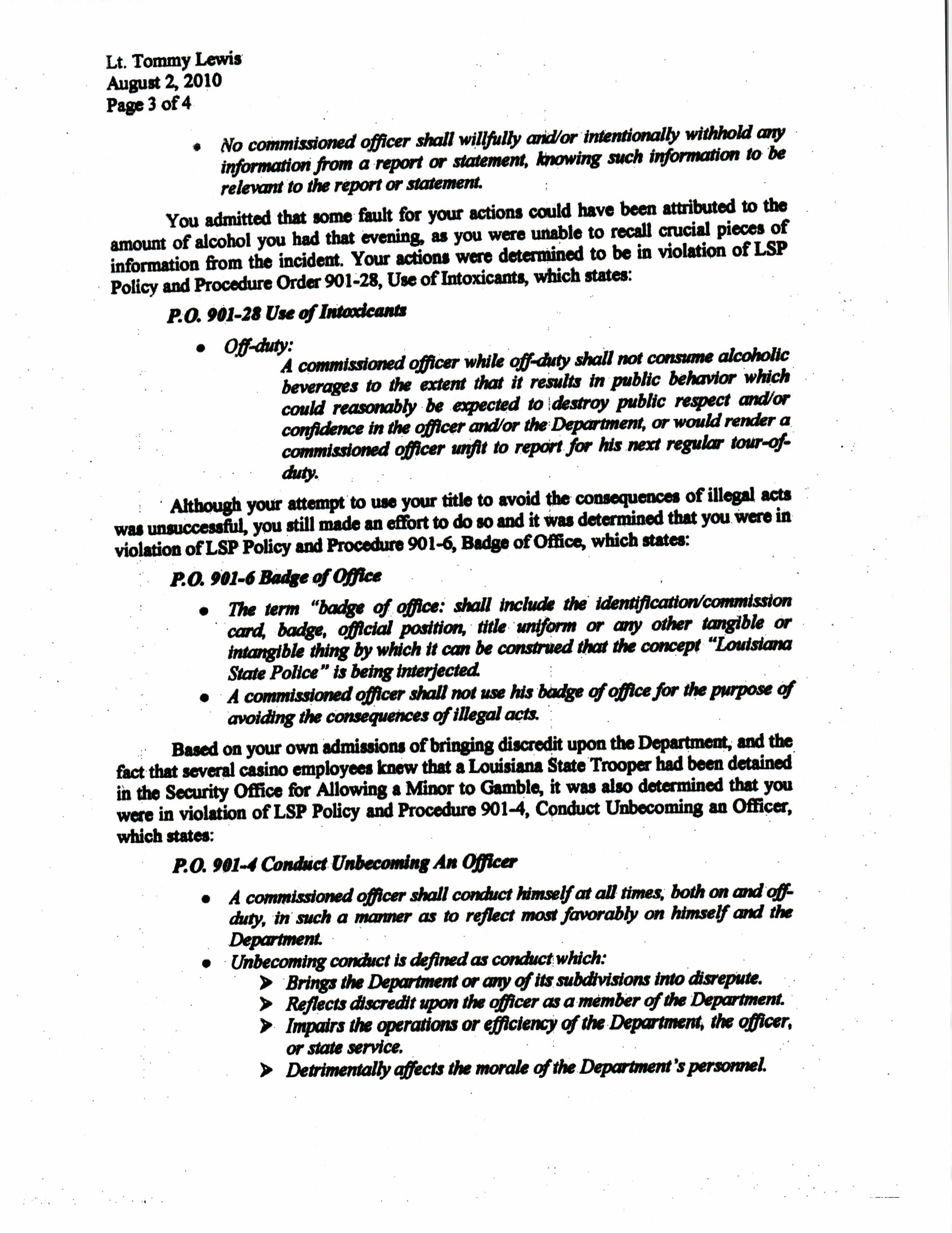 LouisianaVoice obtained a four-page letter of August 2, 2010, in which Edmonson reviewed the events of April 15, 2010, when Lewis, then making $74,200 per year as Executive Officer of LSP Troop F, traveled with seven friends by limousine on a “guys” trip from Monroe to the Ameristar Casino in Vicksburg.