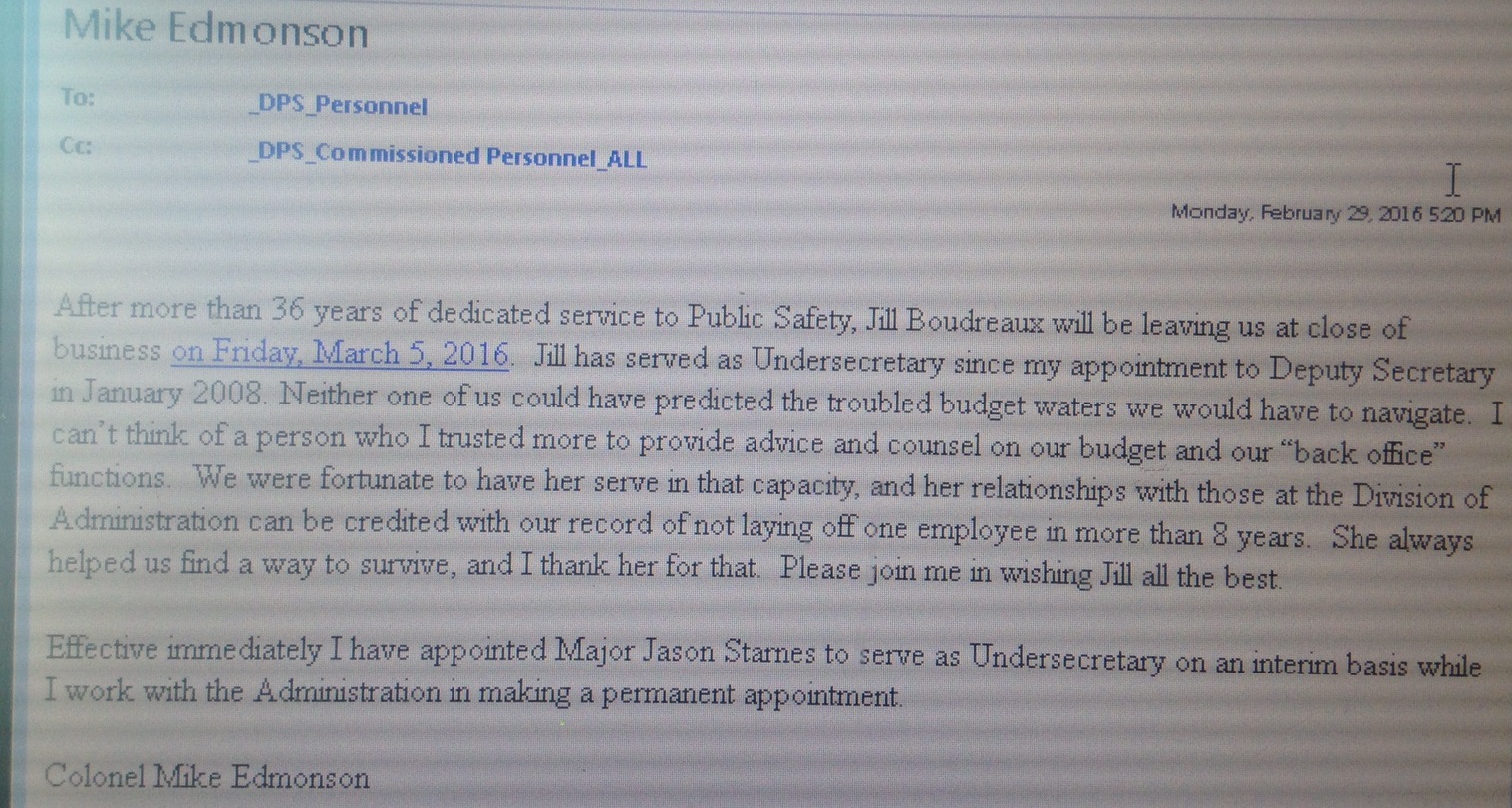 Starnes’ name has since been quietly removed from the DPS Management and Finance Web page and replaced by that of Edmonson who is listed as Deputy Secretary and Custodian of Records. http://mfn.dps.louisiana.gov/