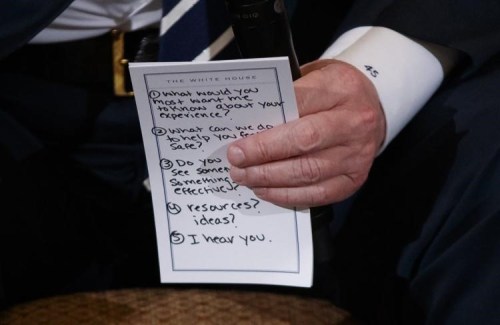 But as bad theater as that was, it paled in comparison to his disgraceful meeting with shooting victims from Parkland, Columbine, and Sandy Hook. He couldn’t even hold an informal meeting without going in with crib notes on how to be spontaneous and empathetic—including a written reminder to say “I hear you.” You had to write that down to remember what to say? Seriously?