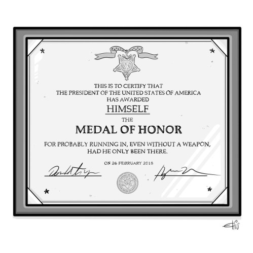 But far and away the most audacious, most self-serving, most self-delusional, most indescribably derisory thing The Trumpinator has uttered his entire presidency (even more so than his “very stable genius” blathering) came when he said he would have entered the school unarmed had he just been there. “I really believe I’d run in there even if I didn’t have a weapon,” he said in his criticism of the deputy who did not engage the Parkland shooter.