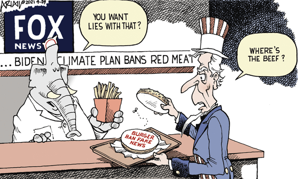 The British Tabloid The Daily Mail ran with the story and Rep. Lauren Boebert (R-Colo.) was quick to tweet that Biden should “stay out of my kitchen” while incorrectly citing a figure of a mandatory 90 percent reduction in meat consumption for the U.S. Meanwhile, Fox continued its usual practice of mauling the truth by running banners across the TV screen proclaiming “bye-bye burgers under Biden’s climate plan” and “90% of red meat out with Biden climate plan.”