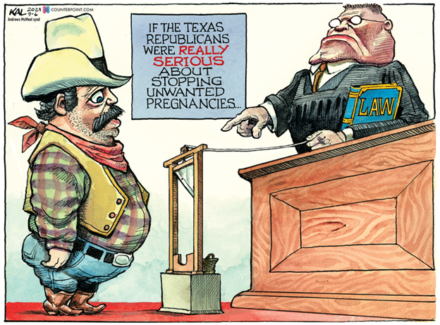—Texas Governor Greg Abbott (right after fixing the state’s electrical grid and ensuring every Texan’s constitutional right to vote, of course. Question, Guv: Why weren’t the rapists eliminated before passing your restrictive abortion law? Looks to me like you got the cart before the hoss.)