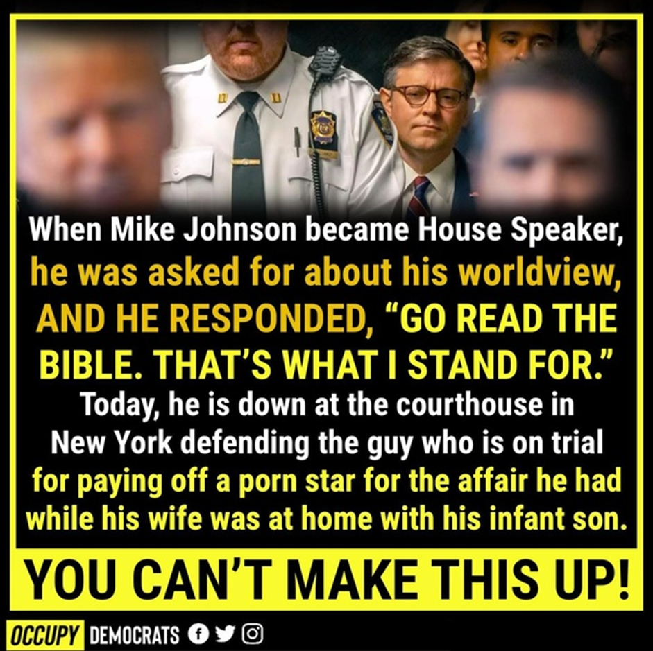 The hypocrisy of people who call themselves Christians is why the church is shedding worshippers like a dog sheds hair. No one forces Mike Johnson to proclaim his faith. But if he chooses to do so then he chooses to publicly hold himself to a higher standard than other men and to have others hold him to that standard as well by proclaiming his faith as something that sets him apart. To then make excuses for why it’s OK – this time, and maybe next time – to NOT live up to those high standards is pure hypocrisy. You either live it ALL the time or you don’t. And if you don’t then there’s nothing particularly special about your faith. From a Christian point of view that’s OK. Many Christians have a faith which is not particularly special. Many struggle trying to live out their faith. But it’s why you don’t stand up and proclaim your faith as something that sets you apart when you can’t (or won’t) live up to those standards in your own life every single day. True faith is not proud; it’s humble.