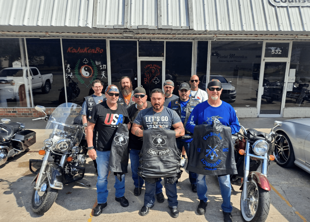 Kindred Vets, the biker club founded by Leon Boudreaux (center). Clay Higgins is at front left. (Mother Jones)