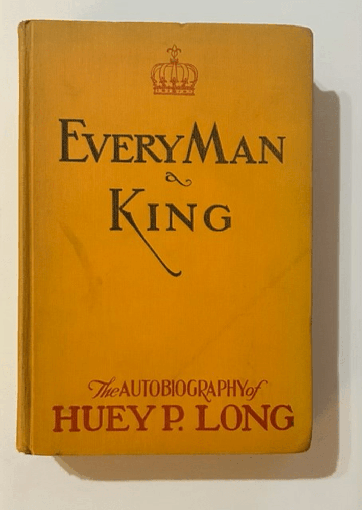 Just as was done last October, a special prize is being offered to the individual who makes the largest single contribution. The prize this year will be a first-edition copy of Huey Long’s autobiography, Every Man a King, shown here: