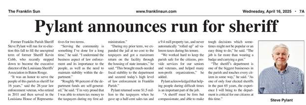 Pylant previously served as sheriff for 16 of his 28 years in law enforcement and followed that by serving eight years in the Louisiana House of Representatives.