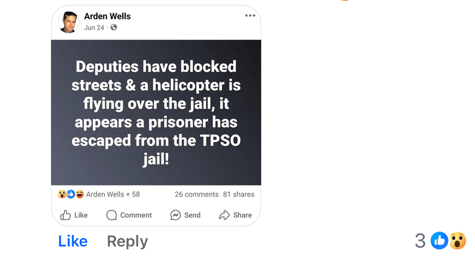 “Just as the law does not allow someone to falsely yell ‘fire’ in the middle of a theater to create panic, or to publish a fake threat against a school to cancel classes out of fear, a person cannot falsely publicize a concerning event like an inmate escape to scare people and we will not tolerate when they do,” said Sheriff Gerald Sticker.