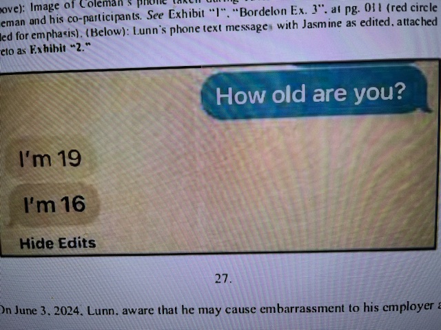 Unbeknownst to Lunn, there was no “Jasmine” and the original text in which she claimed to be 19 was edited to change her age to 16. Lest anyone doubt that claim, there is a method whereby one may edit a text message but it’s only within a narrow window, time-wise. In this case, a screen shot of Lunn’s cellphone clearly shows that the age 19 was indeed edited to 16.