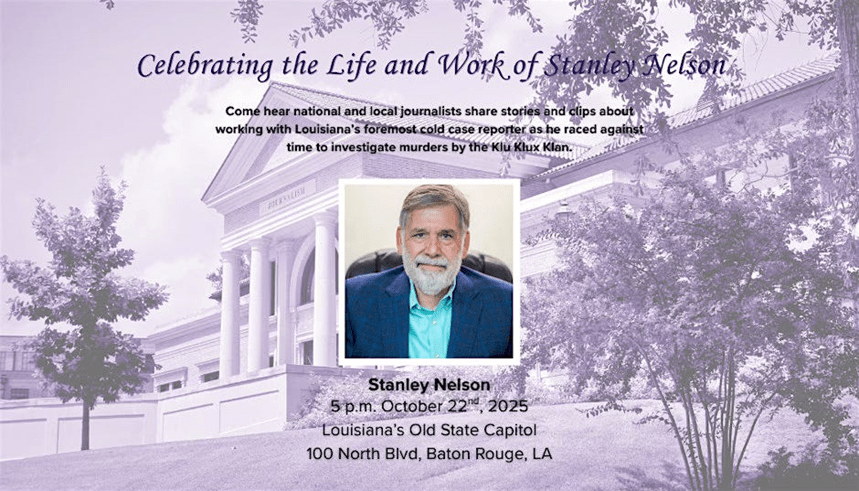 Journalist Stanley Nelson, known for his fearless investigations into unsolved Ku Klux Klan murders in Louisiana and Mississippi, will be honored Wednesday, Oct. 22, at the Old State Capitol in Baton Rouge, 5–7 p.m. The event, hosted by the LSU Manship School of Mass Communication, is free and open to the public.