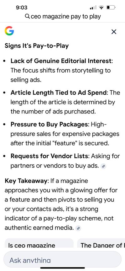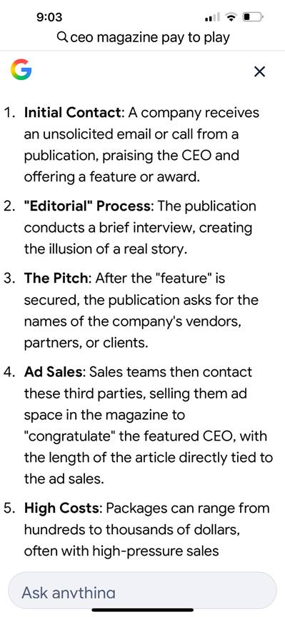 Another tactic is to discreetly inquire of the story’s subject (during the interview process, of course) of the names and contact information for vendors, partners, fellow businessmen or prominent politicians who will subsequently solicitated to place an ad in the magazine congratulating good-ol’-Joe Blow for reaching the pinnacle of his profession by making the cover of the prestigious magazine.