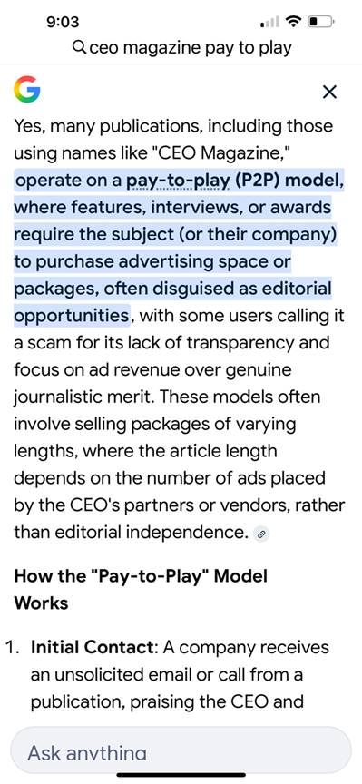 Funny thing, she also claims to be a journalist. Moreover, she presents herself as a writer for CEO Magazine.