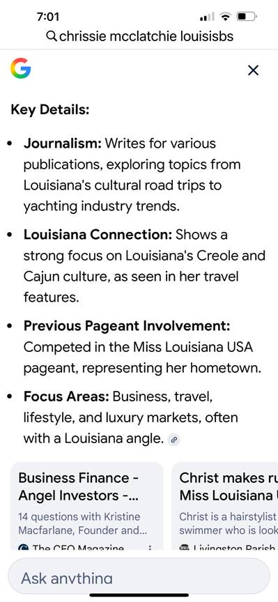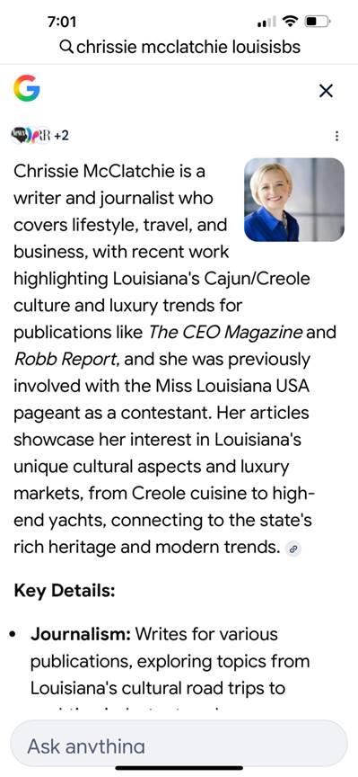 We have a Chrissie McClatchie who describes herself as a “writer and journalist” whose recent work highlighted “Louisiana’s Cajun/Creole culture and luxury trends for publications like The Ceo Magazine and Robb Report…” She includes in her qualifications as a writer the fact that she one was “involved” with the Miss Louisiana USA pageant “as a contestant representing her hometown,” though she neglects to identify that hometown. (Well, I once got a base hit and actually drove in a winning run, so I suppose that qualifies me to play left field for the Red Sox.)