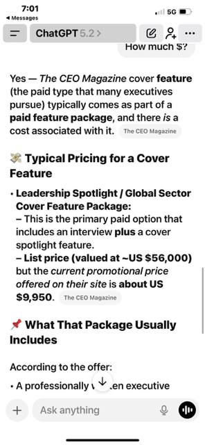 Depending on the length of the story (in this case, the aforementioned 1300 words) and the number of suckers individuals who purchase ads, the cost of gracing the cover and the accompanying feature story can run anywhere from $8000 to $50,000.