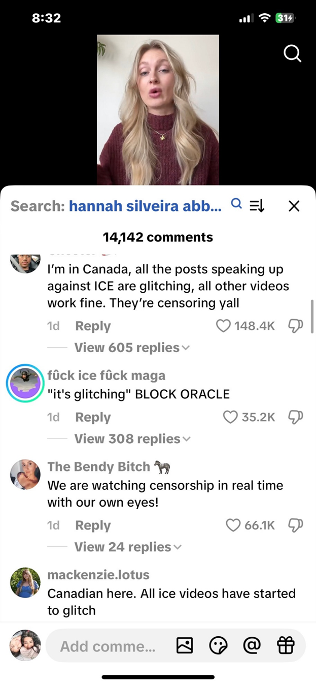 Besides the complaints above, other TikTok users have lodged complaints of alleged censorship of content, much of which is criticisms of the killings in Minneapolis and allowing the Department of Homeland Security to enter homes without judicial warrants.