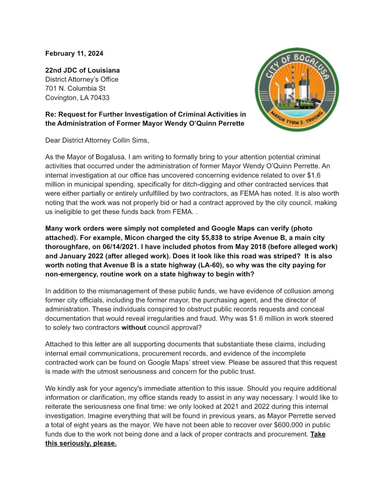 Early in the tenure of Perrette’s successor, Mayor Tyrin Truong formally requested that District Attorney Collin Sims “investigate potential contractor fraud” connected to the administration of Perrette, the Facebook post said, adding that among the questionable transactions were “more than $1 million spent between two contractors without bids or quotes, with work allegedly awarded directly to individuals described by many as friends of the former administration.”