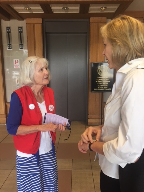 Former U.S. Magistrate Judge Mimi Methvin, right, discusses her candidacy for U.S. Representative from the 3rd Congressional District with Ellen Torgrimson, New Orleans, of the League of Women Voters.