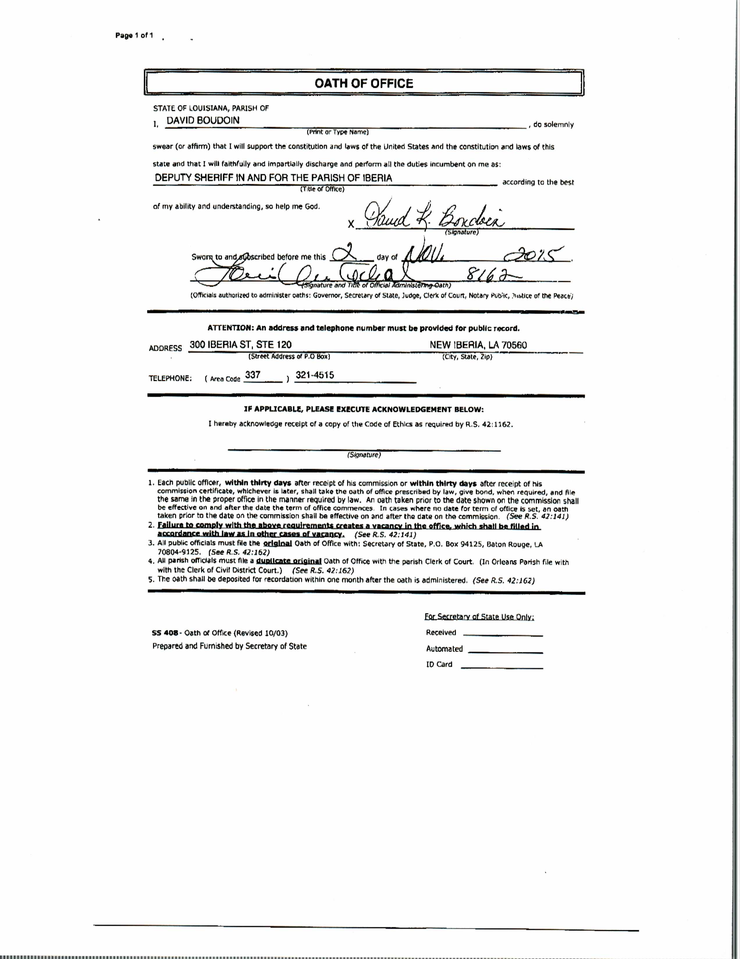 Boudoin signed his oath of office as Iberia Parish deputy on Nov. 2, 2015, only two weeks after the primary election and less than three weeks before the runoff, records show.