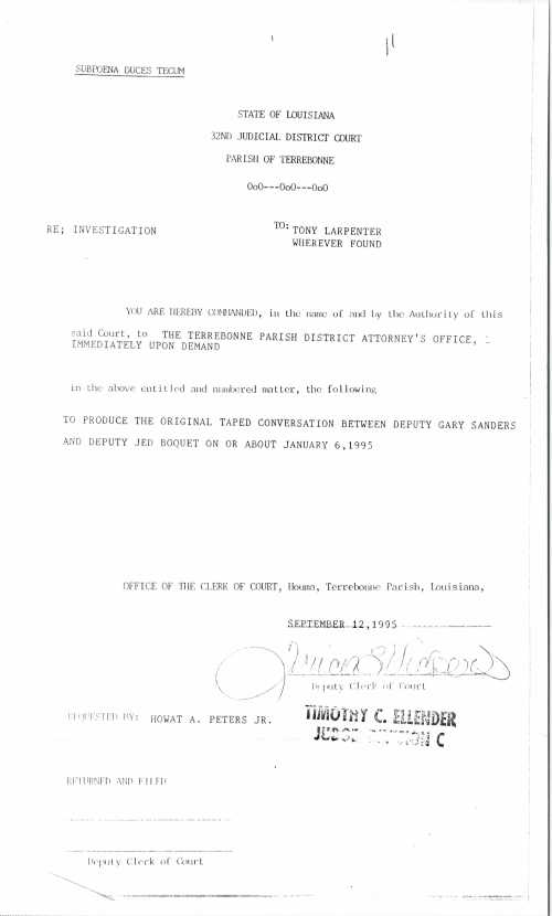 Less than two months later, on September 12, Larpenter, as a precursor to what the Andersons could expect 11 years later, had subpoenas served on his brother and sister-in-law. The subpoena demanded that they “produce the original taped conversation between deputy Gary Sanders and Deputy Jed Boquet on or about January 6, 1995.”