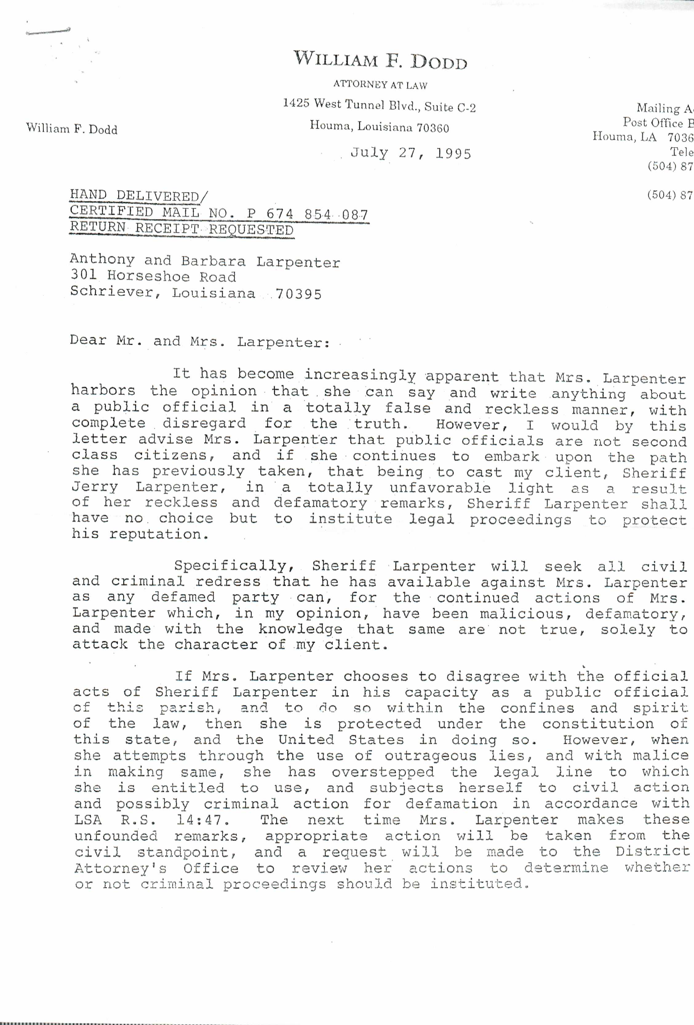 It was July 27, 1995, when Larpenter called upon his legal counsel, Houma attorney William F. Dodd (if that name seems familiar, it’s probably because his pappy, William J. Dodd, served as state auditor, lieutenant governor, and state superintendent of education and twice ran—and lost—for governor) to fire off a two-page threatening letter to brother Anthony Larpenter and his wife, Barbara.