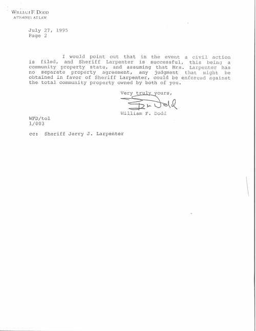 Dodd ended his July letter on a really ugly and sinister note when he wrote, “I would point out that in the event a civil action is filed, and Sheriff Larpenter is successful, this being a community property state, and assuming that Mrs. Larpenter has no separate property agreement, any judgment that might be obtained in favor of Sheriff Larpenter, could be entered against this total community property owned by both of you.”