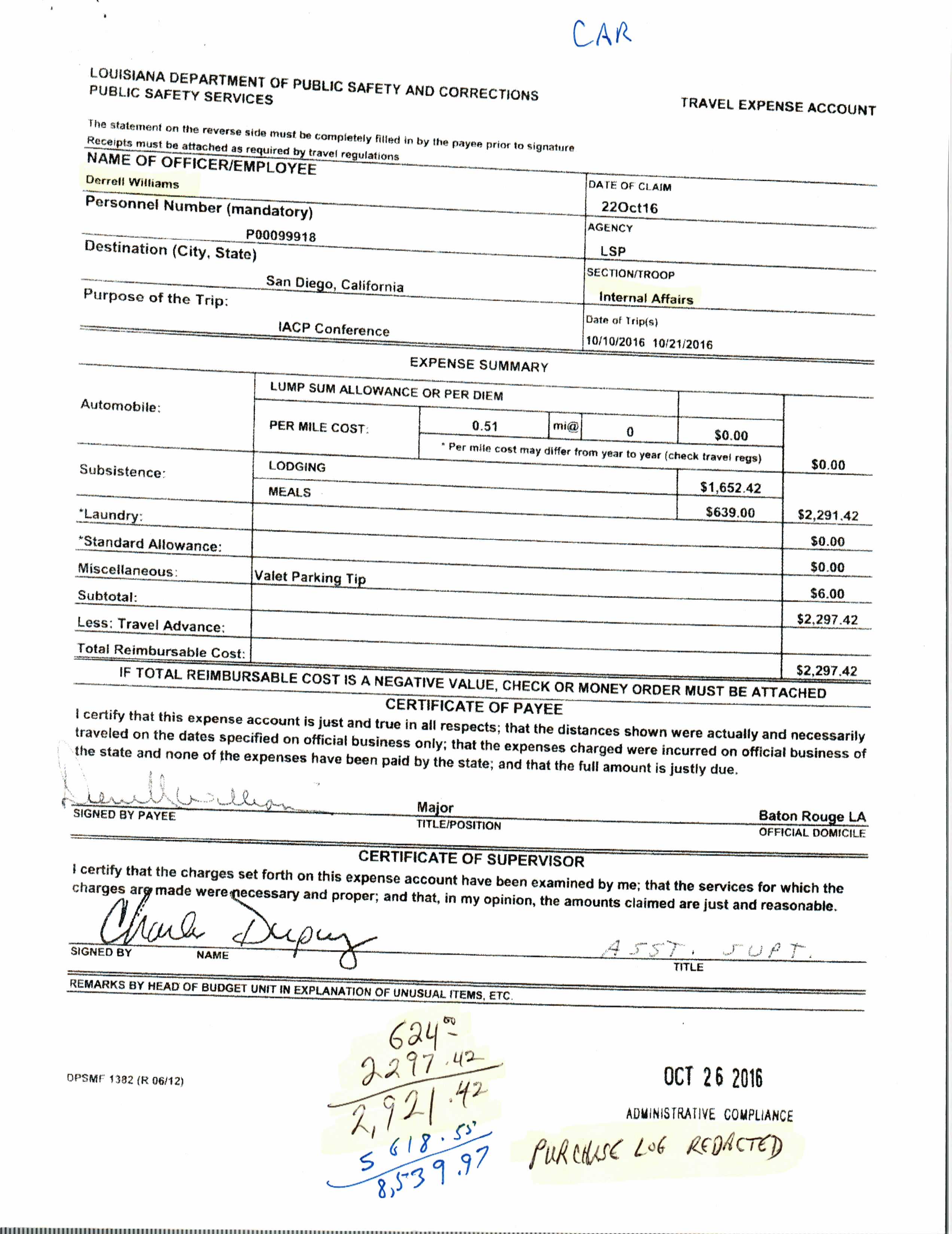 So much for the Loyalty part of that “Courtesy, Loyalty, Service” motto of the Louisiana State Police. If you’re going to give permission (as Edmonson did) for four men to drive to California and they take a state vehicle permanently assigned to your second in command, and that same second in command (Dupuy) signs off on the expenses of the senior member of the four (Williams), then it necessarily means that the top brass of Louisiana State Police (Edmonson, Dupuy, et al) were complicit and Edmonson can hardly discipline the four without coming down on Dupuy as well.