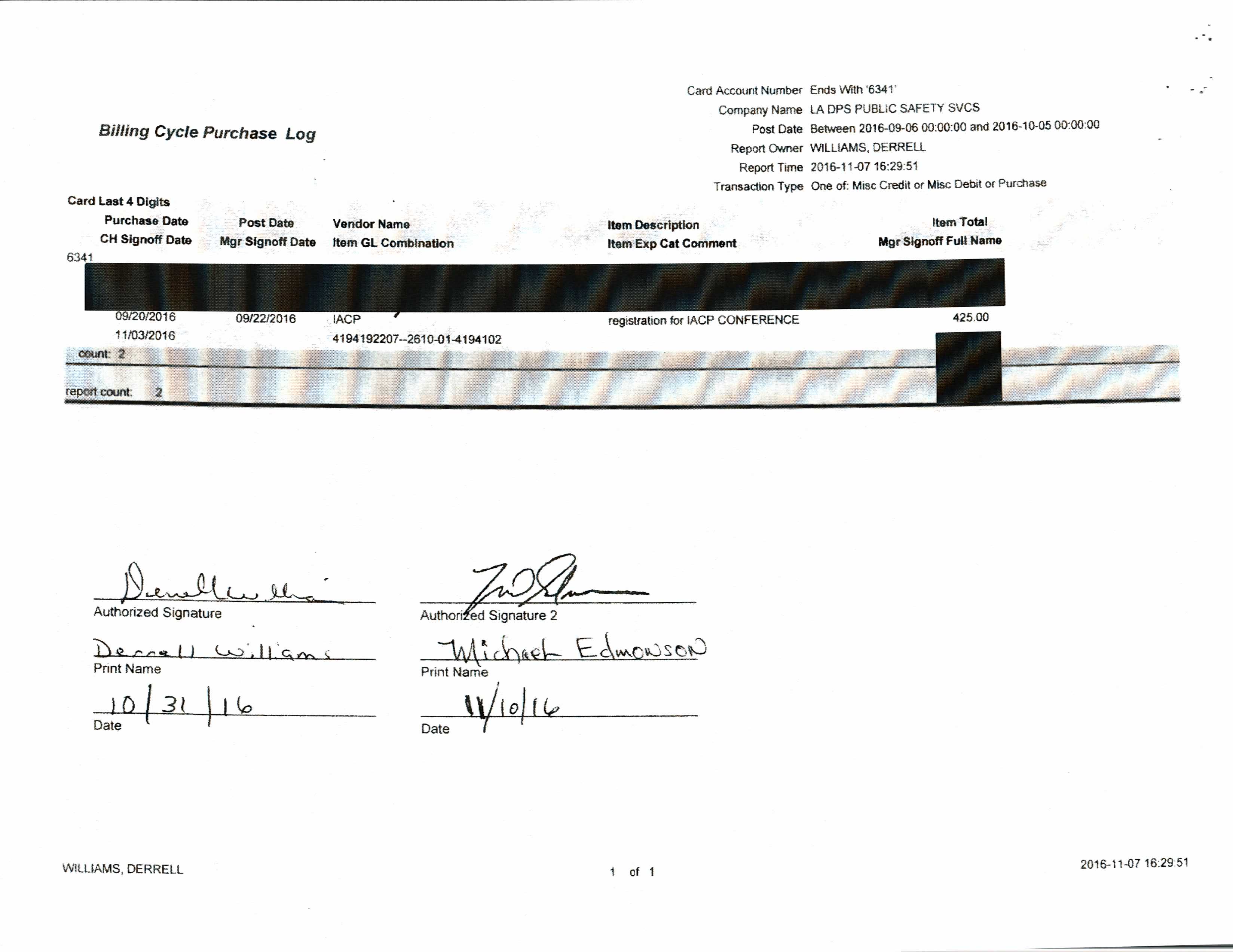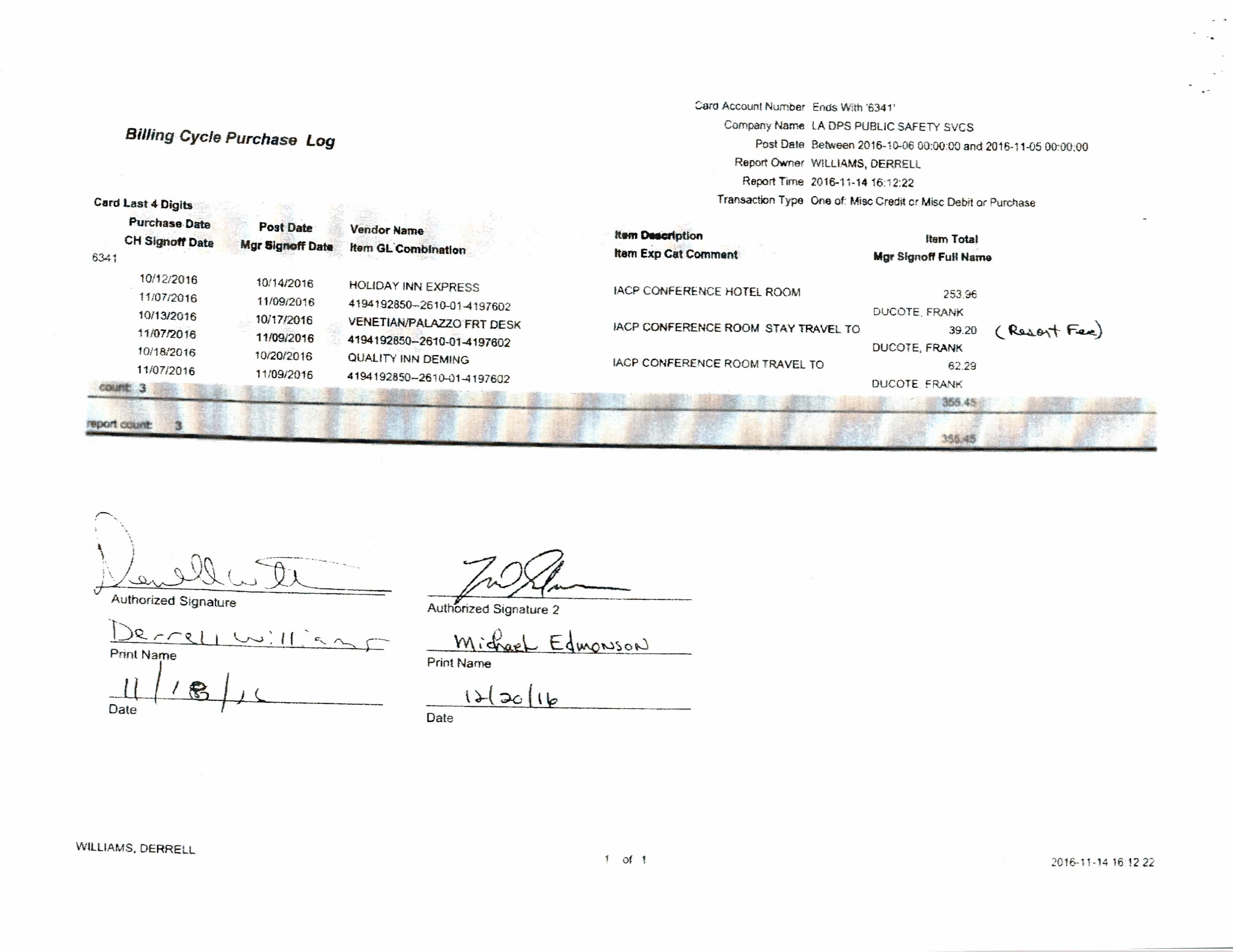 Interestingly, Williams’s supervisor who signed off on his $2,297.42 expense report was Lt. Col. Charles Dupuy, to whom the vehicle they drove is permanently assigned. That leaves unanswered the question of whether Edmonson’s investigation would extend to his second in command for approving the use of his vehicle and for approving the expenditures.
