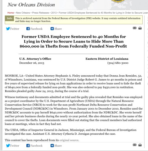 In December 2013, a press release from the U.S. Attorney’s Office in New Orleans said Ms. Remides was sentenced to 40 months imprisonment for lying in order to secure loans to hide more than $600,000 in thefts from the federally-funded non-profit Northeast Delta Resource Conservation and Development Council (NDRC&DC).