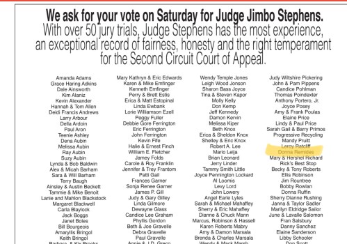 Granted, Stephens has no control over who purchases a newspaper advertisement to endorse his candidacy. But that, coupled with the controversy over his refusal to recuse his pal Doughty from a trial involving a LAWSUIT against a bank with some questionable links to Doughty, the flippant remark about illegal night hunting, the office space at Vantage, the same personalities tying both judges to Vantage, Abraham and Ellington…