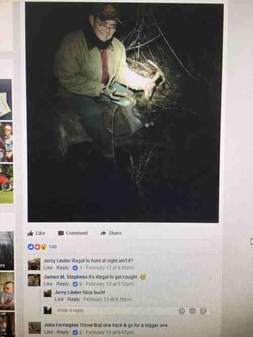 But the minor issue of where his office is housed doesn’t seem to be the type of thing that would bother Stephens anyway. After all, there is a photo, apparently posted on his Facebook page that shows him holding up the antlers of a deer he shot—at night? One person commented, “Illegal to hunt at night, ain’t it?” to which Stephens replied, “It’s illegal to get caught.”