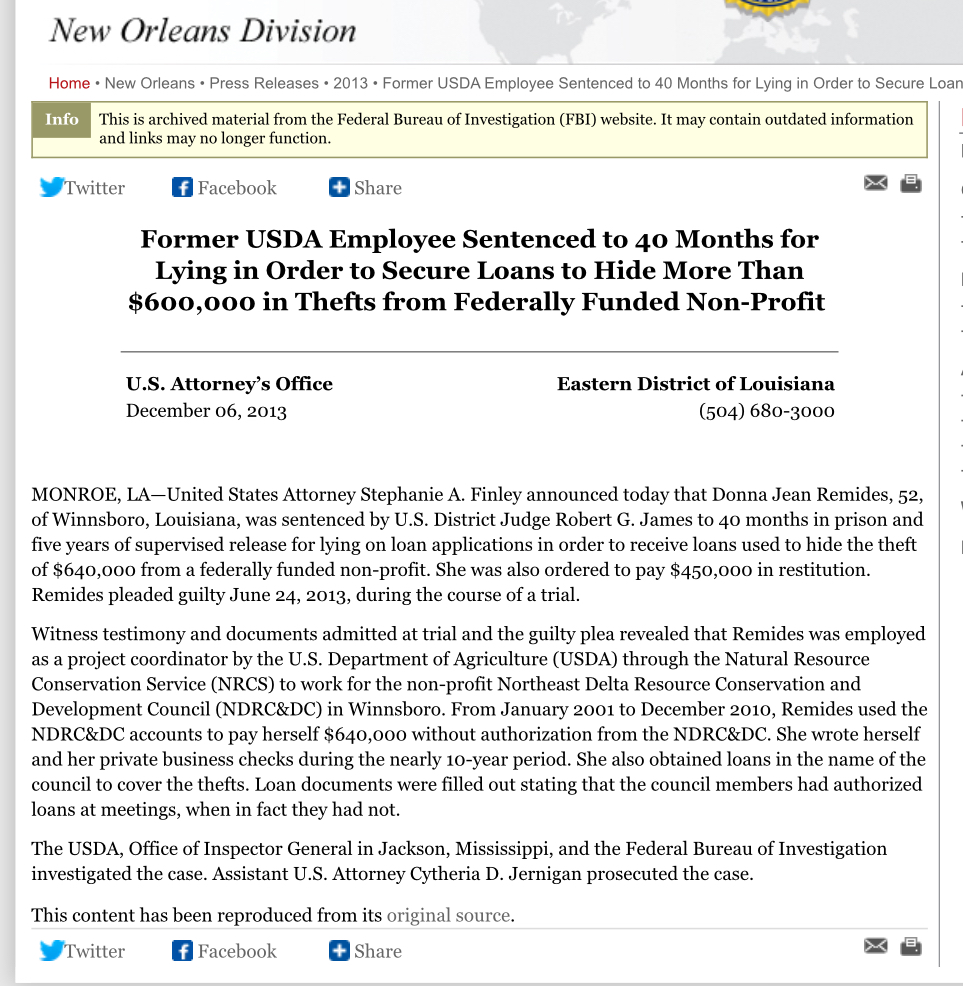 In December 2013, a press release from the U.S. Attorney’s Office in New Orleans said Ms. Remides was sentenced to 40 months imprisonment for lying in order to secure loans to hide more than $600,000 in thefts from the federally-funded non-profit Northeast Delta Resource Conservation and Development Council (NDRC&DC).