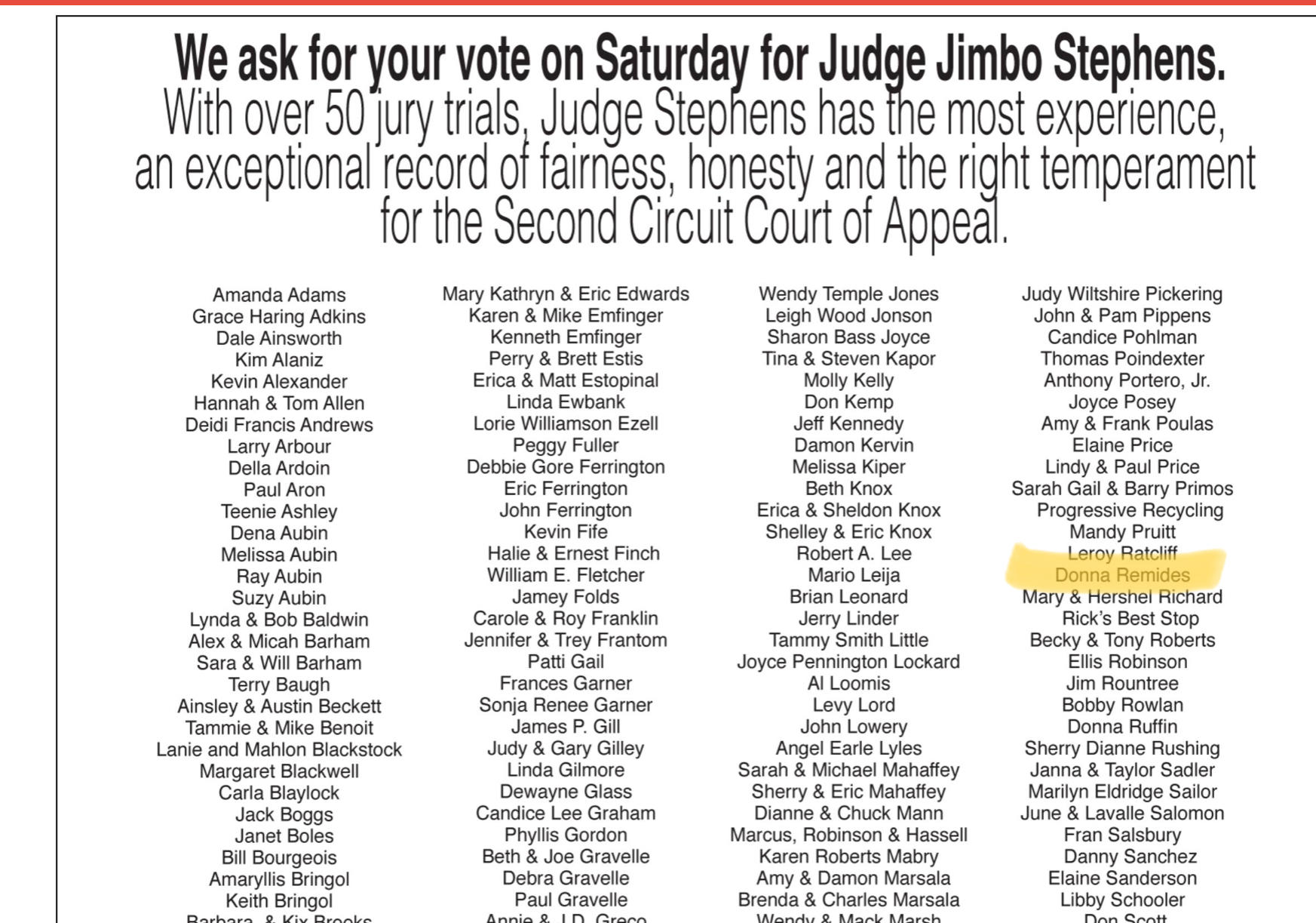 And when he was running for the appellate court in 2016, there were more than 160 people who signed onto a newspaper ad endorsing his candidacy. Among them was one Donna Remides.